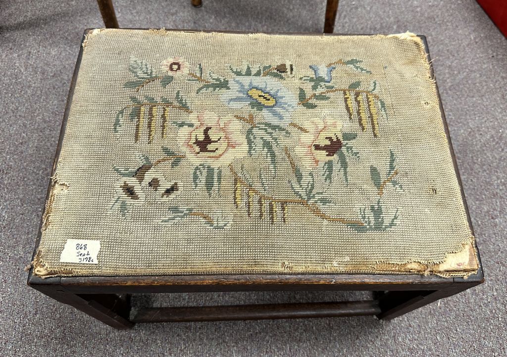 Vintage Oak Needle Point Vanity Stool, age wear, needle point is damaged, 14"h., 18"w, Location Row 4 Vintage Oak Needle Point Vanity Stool, age wear, needle point is damaged, 14"h., 18"w, Location Row 4