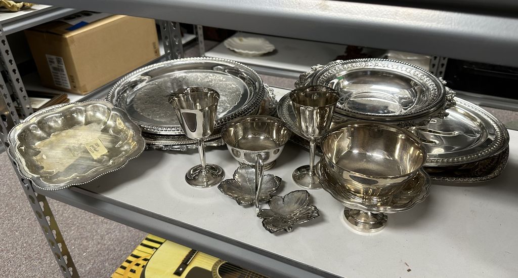 Collection of Silverplate Serving Pieces, platters, trays, goblets, bowls, Location Left Back Metal Shelves Collection of Silverplate Serving Pieces, platters, trays, goblets, bowls, Location Left Back Metal Shelves