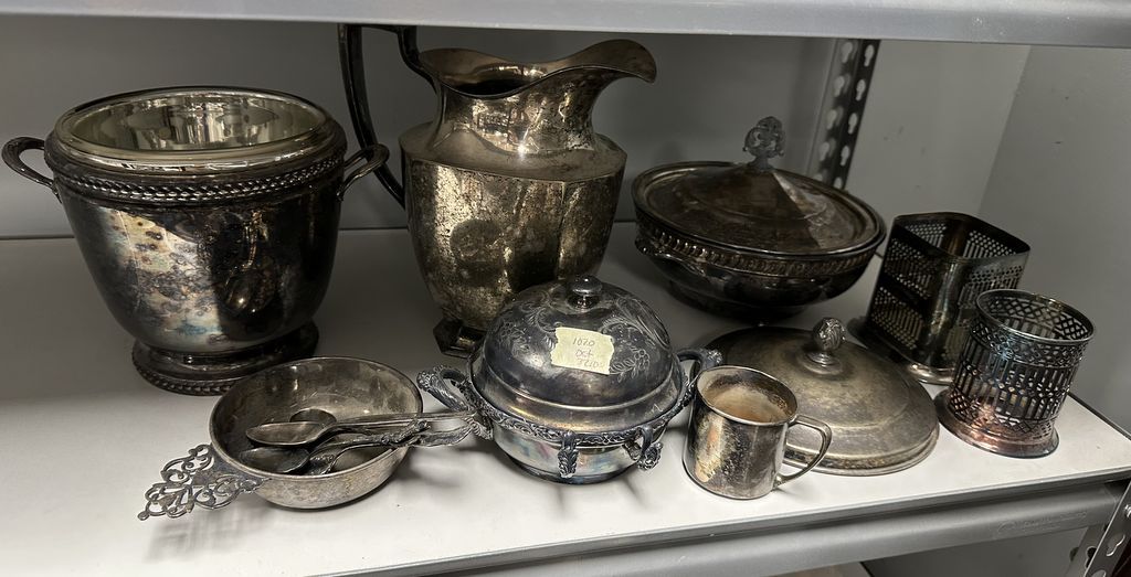 Collection of Silver Plate Serving Pieces, Location Back Left Metal Shelves Collection of Silver Plate Serving Pieces, Location Back Left Metal Shelves