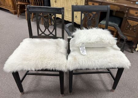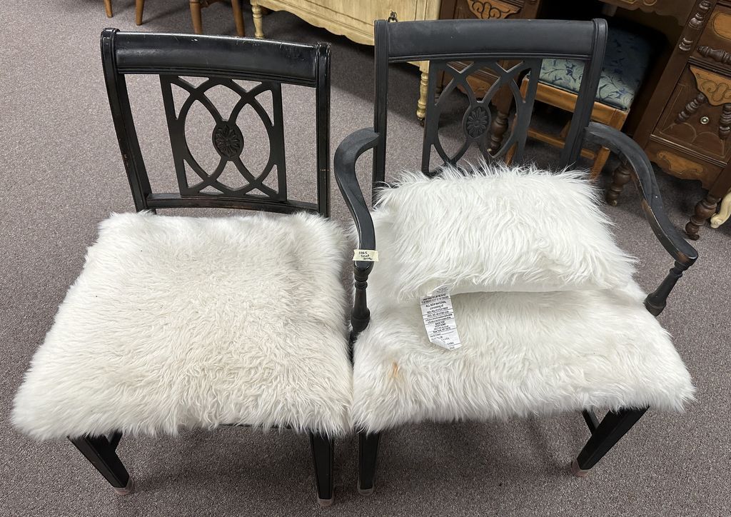 Two Painted Sheraton Style Dining Chairs, with faux fur cushions, Location Right Office 1 Two Painted Sheraton Style Dining Chairs, with faux fur cushions, Location Right Office 1