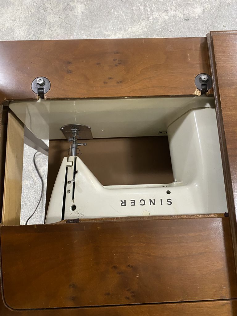 Mid Century Sewing Cabinet with Singer Machine, included accessories. Location Row 6 Mid Century Sewing Cabinet with Singer Machine, included accessories. Location Row 6