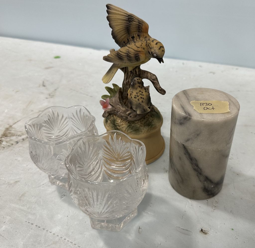 1130 Ceramic Musical Birds, Marble Container, and Glass Votives