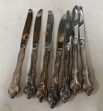 7 Silver Plate Dinner Knives, Location Front Wood Slant Case 7 Silver Plate Dinner Knives, Location Front Wood Slant Case