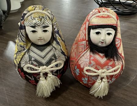 Two Vintage Japanese Doll Nishiki Daruma, Location Right Metal Shelves Two Vintage Japanese Doll Nishiki Daruma, Location Right Metal Shelves