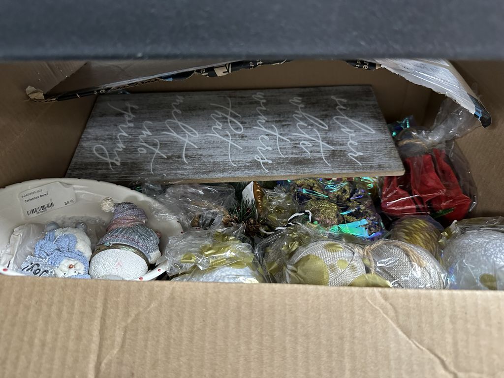 Box Lot of Christmas Decorations, Location Right Black Shelves Box Lot of Christmas Decorations, Location Right Black Shelves