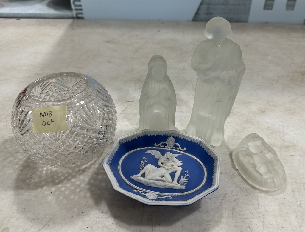 1408 Frosted Glass Nativity Figurines, Glass Vase, and Blue Plaque
