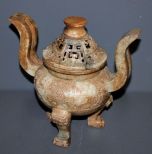 Vintage Chinese Soapstone Incense Burner, three legged, two handle. Lid has cut out Chinese design; 10" h., 9 1/2" dia. Vintage Chinese Soapstone Incense Burner, three legged, two handle. Lid has cut out Chinese design; 10" h., 9 1/2" dia.