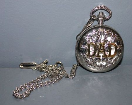 Decorative Pocket Watch with Roman Numerals in Original Box, battery operated pocket watch, filigree with DAD in gold letters, has chain 1 1/4" dia. Decorative Pocket Watch with Roman Numerals in Original Box, battery operated pocket watch, filigree with DAD in gold letters, has chain 1 1/4" dia.