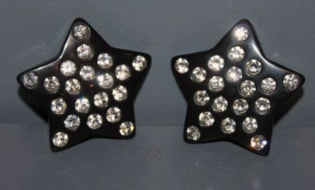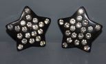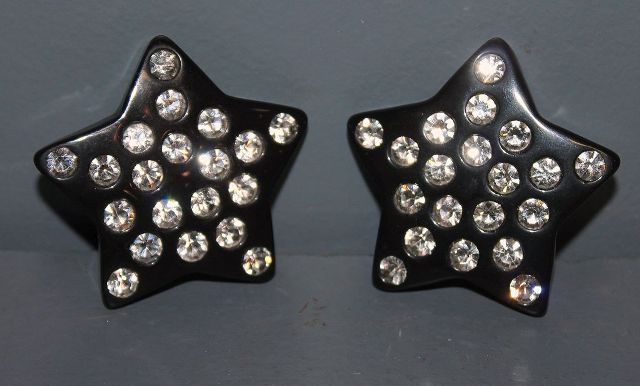 Pair of Large Bakelite Clip On Earrings, black with rhinestones in star shape; 2" dia. Pair of Large Bakelite Clip On Earrings, black with rhinestones in star shape; 2" dia.