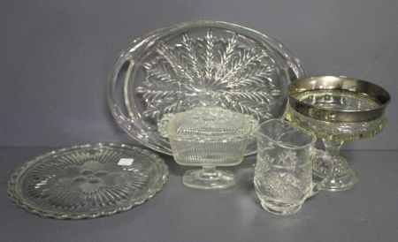 Group of Press Glass; Wexford 5" pitcher, divided glass platter with handles 15 1/2", cake tray 11" round, covered rectangular candy dish 6 1/2" w., 7 1/2" h.; open compote with silver trim 7" dia. Group of Press Glass; Wexford 5" pitcher, divided glass platter with handles 15 1/2", cake tray 11" round, covered rectangular candy dish 6 1/2" w., 7 1/2" h.; open compote with silver trim 7" dia.