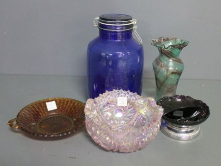 Five Pieces of Glass; merigold carnival glass bowl 9" dia., pink pinwheel pattern bowl 7 1/2" dia., divided amethyst bowl with chrome base 5 1/2" dia., green swirl glass vase 8" h., Mills Bakery 4 Quart covered blue jar 11" h. Five Pieces of Glass; merigold carnival glass bowl 9" dia., pink pinwheel pattern bowl 7 1/2" dia., divided amethyst bowl with chrome base 5 1/2" dia., green swirl glass vase 8" h., Mills Bakery 4 Quart covered blue jar 11" h.