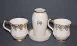 Two Royal Copenhagen pieces, small vase 5 1/2" h., round dish 4 1/4" dia., Two 50th Anniversary Royal Albert cups 3 1/2" dia. Two Royal Copenhagen pieces, small vase 5 1/2" h., round dish 4 1/4" dia., Two 50th Anniversary Royal Albert cups 3 1/2" dia.