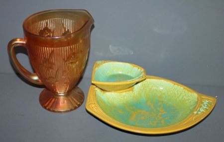 278 Merigold "Iris" Carnival Glass Pitcher and Divided Dip and Chip Pottery Tray