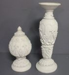Two Resin Pieces; architectural finial 13" h., 6" dia.; candlestick 18 1/2" h., 5" dia. Two Resin Pieces; architectural finial 13" h., 6" dia.; candlestick 18 1/2" h., 5" dia.