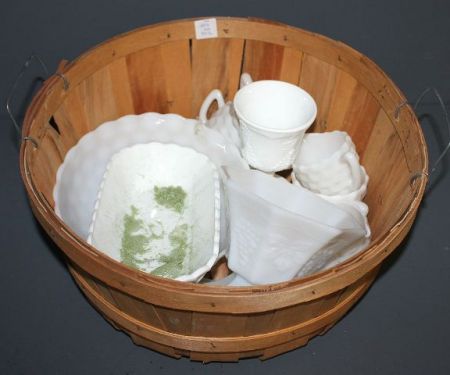 Basket Lot of Milk Glass; 8' bowl, 10 1/2" tray, vase 5" h., creamer cups Basket Lot of Milk Glass; 8' bowl, 10 1/2" tray, vase 5" h., creamer cups
