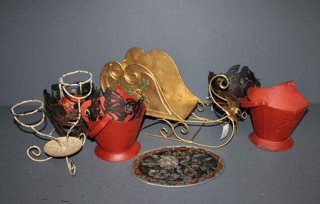 Group of Miscellaneous Items, group includes; basket, iron candlestick, gold Christmas sleigh (15" l.),oval stain glass (9" h., 6" w.), and three tin pots Group of Miscellaneous Items, group includes; basket, iron candlestick, gold Christmas sleigh (15" l.),oval stain glass (9" h., 6" w.), and three tin pots