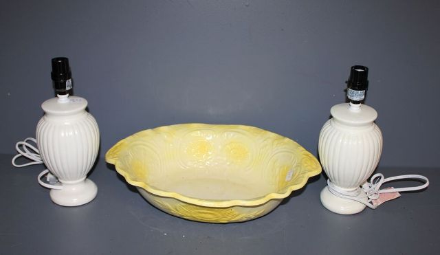 Yellow Ceramic Bowl (17 1/2" l., 13" w.) and Two Painted White Urn Shaped Lamps (12 1/2" h.) Yellow Ceramic Bowl (17 1/2" l., 13" w.) and Two Painted White Urn Shaped Lamps (12 1/2" h.)