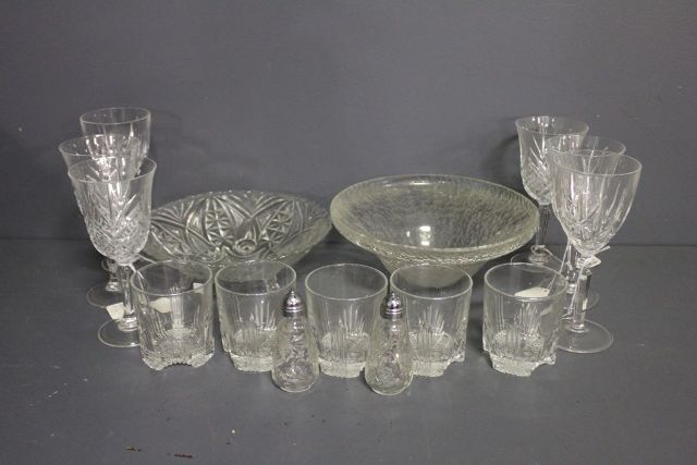 Group of Miscellaneous Glass Items, group includes; bowls 10" dia., six stem glasses, five tumblers, salt and pepper Group of Miscellaneous Glass Items, group includes; bowls 10" dia., six stem glasses, five tumblers, salt and pepper