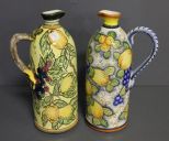 Two Ceramic Fruit Painted Pitchers; 16" h., 6 1/2" dia. Two Ceramic Fruit Painted Pitchers; 16" h., 6 1/2" dia.