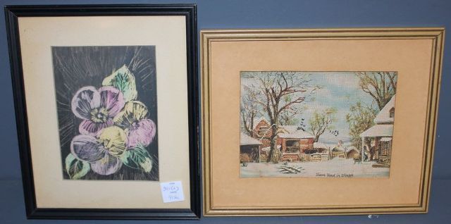 Print of Pansies (8 1/2" w., 10" h.) and Stitchwork of Farm Yard in Frame (10 1/2" w., 8 1/2" h.) Print of Pansies (8 1/2" w., 10" h.) and Stitchwork of Farm Yard in Frame (10 1/2" w., 8 1/2" h.)
