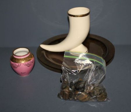 Candle and Rock Display (10" dia.) , Ceramic Horn (6" h.) and Pink Bavarian Vase (4" h.) Candle and Rock Display (10" dia.) , Ceramic Horn (6" h.) and Pink Bavarian Vase (4" h.)