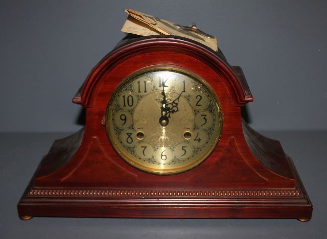 "The Tambour Mantel Clock", has owners manual, key 18" w., 11 1/2" h. "The Tambour Mantel Clock", has owners manual, key 18" w., 11 1/2" h.