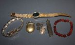 Group of Miscellaneous Jewelry and Two Pocket Knives, group includes; metal portrait bracelet with bird design on links, red bead bracelet, silver colored bracelet monogrammed "Janet", Geneva watch (green face, marked base metal), ladybug watch pendant (marked Aluminum Cicada Watch Swiss MOVT), small pocket knife marked gold filled and monogrammed, small pocket knife marked "VOOS" with gold handle design Group of Miscellaneous Jewelry and Two Pocket Knives, group includes; metal portrait bracelet with bird design on links, red bead bracelet, silver colored bracelet monogrammed "Janet", Geneva watch (green face, marked base metal), ladybug watch pendant (marked Aluminum Cicada Watch Swiss MOVT), small pocket knife marked gold filled and monogrammed, small pocket knife marked "VOOS" with gold handle design