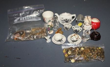 Group of Miscellaneous Items; glass pieces, bag of costume jewelry, bag of pins, small tea set, figurines Group of Miscellaneous Items; glass pieces, bag of costume jewelry, bag of pins, small tea set, figurines