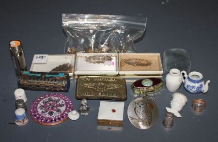 Group of Miscellaneous Items, group includes; pewter duck, pill box with Oakleigh design, five thimbles, ring, two watches, bead decorated mirror, Precious Moments piece, Reed and Barton owl pendant, three decanter labels (Rye, Bourbon, Scotch), brass belt buckle, pill box with ladybug design, small blue and white teapot, matchstick holder Group of Miscellaneous Items, group includes; pewter duck, pill box with Oakleigh design, five thimbles, ring, two watches, bead decorated mirror, Precious Moments piece, Reed and Barton owl pendant, three decanter labels (Rye, Bourbon, Scotch), brass belt buckle, pill box with ladybug design, small blue and white teapot, matchstick holder
