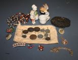 Group of Miscellaneous Items, group includes; bag of world coins, small tray, miscellaneous costume jewelry, five chains (one broken), cup, three figurines Group of Miscellaneous Items, group includes; bag of world coins, small tray, miscellaneous costume jewelry, five chains (one broken), cup, three figurines