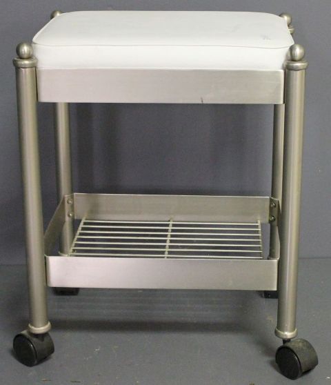 Chrome Bench with White Vinyl Top and Shelf; 16" w., 12 1/2" d., 20 1/2" h. Chrome Bench with White Vinyl Top and Shelf; 16" w., 12 1/2" d., 20 1/2" h.