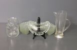 Two Glass Pitchers and Thirteen Clear Glass Bone Dishes, dishes (8" l., 4" w.) one pitcher is 6 3/4" h., other pitcher is 9 3/4" h. Two Glass Pitchers and Thirteen Clear Glass Bone Dishes, dishes (8" l., 4" w.) one pitcher is 6 3/4" h., other pitcher is 9 3/4" h.