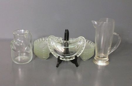 572 Two Glass Pitchers and Thirteen Clear Glass Bone Dishes Description