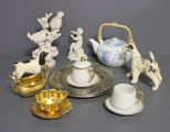 Group of Porcelain Items, group contains; two porcelain dogs, teapot, two bisque figurines, gold whiting company pitchers, gold cup, saucer (damaged) two gold and white cups and saucers, three Silverplate plates Group of Porcelain Items, group contains; two porcelain dogs, teapot, two bisque figurines, gold whiting company pitchers, gold cup, saucer (damaged) two gold and white cups and saucers, three Silverplate plates