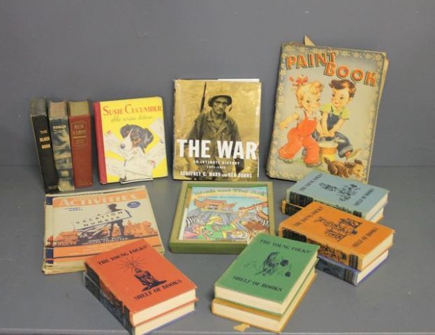 Group of Vintage Books, group includes; 1944 Susie Cucumber, Collection of "The Young Folks", 1945's coloring books, New book "The War" by Geoffrey Ward Group of Vintage Books, group includes; 1944 Susie Cucumber, Collection of "The Young Folks", 1945's coloring books, New book "The War" by Geoffrey Ward