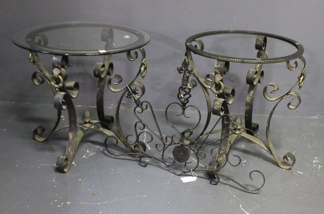 Two Iron Glass Top Tables and Iron Wall Piece, glass on one table missing, tables 25" dia., 23" h., wall plaque 32" w., 21 1/2" h. Two Iron Glass Top Tables and Iron Wall Piece, glass on one table missing, tables 25" dia., 23" h., wall plaque 32" w., 21 1/2" h.