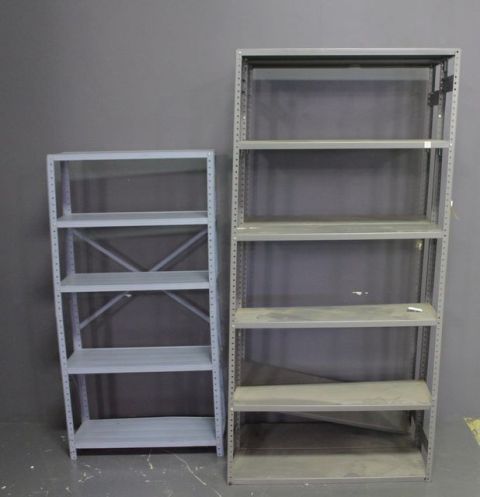 Three Grey Metal Storage Shelves, 29"w, 58"h. Pair 36"w, 24"d, Three Grey Metal Storage Shelves, 29"w, 58"h. Pair 36"w, 24"d,