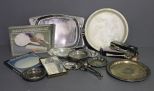 Group of Silverplate Items, group includes; 5" bowls, 9" tray, salad forks, chrome tray, chrome covered butter dish, dresser set Group of Silverplate Items, group includes; 5" bowls, 9" tray, salad forks, chrome tray, chrome covered butter dish, dresser set