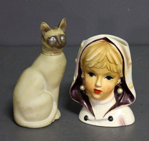 Vintage Perfume Bottle in Shape of Cat (Moonwind), along with vintage Rubens head vase Vintage Perfume Bottle in Shape of Cat (Moonwind), along with vintage Rubens head vase