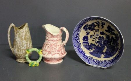 Four Pieces of Pottery, Willow bowl (from Japan) 9 1/2" dia., brown and white pitcher 8" h., pink and white 7" ceramic pitcher, large napkin ring Four Pieces of Pottery, Willow bowl (from Japan) 9 1/2" dia., brown and white pitcher 8" h., pink and white 7" ceramic pitcher, large napkin ring