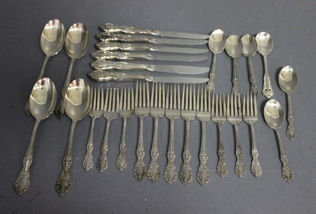Roger's Brothers Silverplate Flatware, extraplate; includes; six knives, five dinner forks, four salad forks, six soup spoons, four serving spoons Roger's Brothers Silverplate Flatware, extraplate; includes; six knives, five dinner forks, four salad forks, six soup spoons, four serving spoons