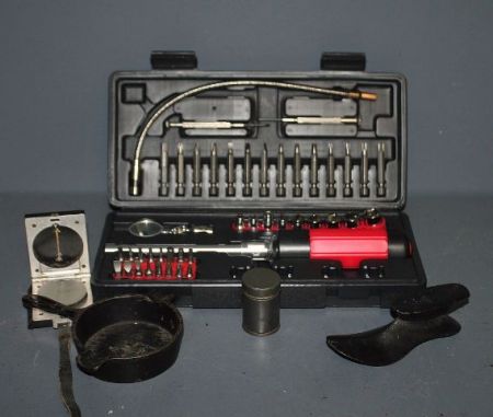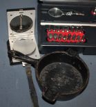 Group of Miscellaneous items, includes; Hutto-Gladden miniature iron skillet 4 1/2" dia., small iron shoe 5" l. (40) compass, small cylinder tin can 2" h. Group of Miscellaneous items, includes; Hutto-Gladden miniature iron skillet 4 1/2" dia., small iron shoe 5" l. (40) compass, small cylinder tin can 2" h.