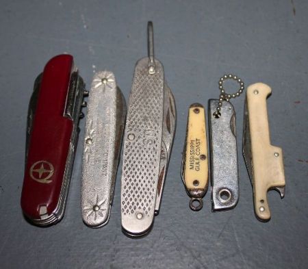 Group of Pocket Knives, includes; 3 1/2" maroon, 2" Mississippi Gulf Coast, 3 1/2" US, 3 1/4" Knox Woolen company, Camden, Maine, 2 1/2" General Electric, 3" vintage Group of Pocket Knives, includes; 3 1/2" maroon, 2" Mississippi Gulf Coast, 3 1/2" US, 3 1/4" Knox Woolen company, Camden, Maine, 2 1/2" General Electric, 3" vintage