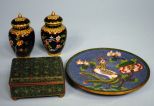 Blue Cloisonne Plate w/Phoenix bird decoration. 6 1/4",Small 1920s Chinese Export green Cloisonne box on brass ball feet. 3 3/4"w x 3"d x 1 1/2"h, Small pair black Cloisonne vases w/floral decoration. 4"h x 7" round Blue Cloisonne Plate w/Phoenix bird decoration. 6 1/4",Small 1920s Chinese Export green Cloisonne box on brass ball feet. 3 3/4"w x 3"d x 1 1/2"h, Small pair black Cloisonne vases w/floral decoration. 4"h x 7" round