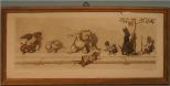 128 Artist Signed Vintage French Watercolor of Dogs, "Wait in line"
