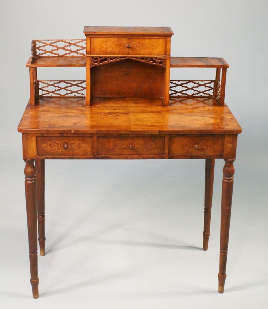 Bonheur Du Jou Lady's Writing Desk. Walnut three drawer base w/upper gallery having fretwork (some missing). Inlay on drawers, 32"w x 17"d x 40 1/2"h Bonheur Du Jou Lady's Writing Desk. Walnut three drawer base w/upper gallery having fretwork (some missing). Inlay on drawers, 32"w x 17"d x 40 1/2"h