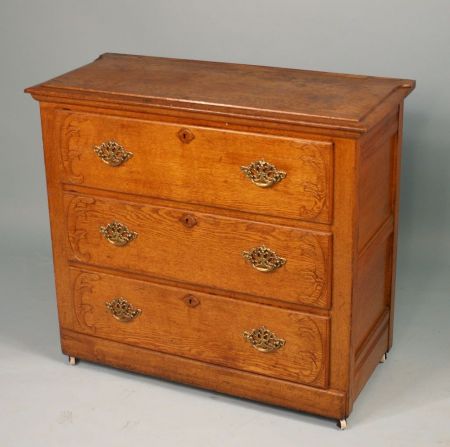 1900's Oak three drawer chest w/brass hardware. Each drawer has applied decoration, 38"w x 17"d x 33"h 1900's Oak three drawer chest w/brass hardware. Each drawer has applied decoration, 38"w x 17"d x 33"h