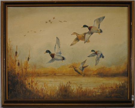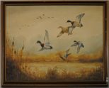 Oil Painting of Flying Ducks, signed Jason Watkins, 27"w x 20 1/2"h Oil Painting of Flying Ducks, signed Jason Watkins, 27"w x 20 1/2"h