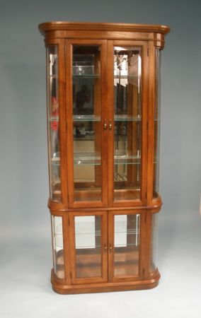 Modern Display Cabinet, curved glass, lighted. Two center glass doors that open w/three glass interior shelves. Same design on base. Beautiful curved glass on the corners. 36"w x 12"d x 76 1/2"h Modern Display Cabinet, curved glass, lighted. Two center glass doors that open w/three glass interior shelves. Same design on base. Beautiful curved glass on the corners. 36"w x 12"d x 76 1/2"h