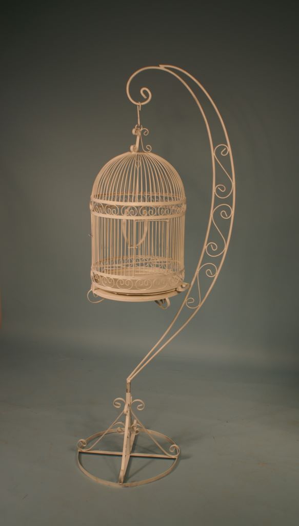 Old painted white Iron Bird Cage. Has original porcelain bowls for water and food. 16 1/2"round x 71"h Old painted white Iron Bird Cage. Has original porcelain bowls for water and food. 16 1/2"round x 71"h